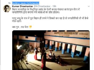 जिस ट्विटर यूजर के ट्वीट को RJD ने रिट्विट किया है उसने लिखा है, बिहार समस्तीपुर के विभूतिपुर प्रखंड के देवरी करख पंचायत क्वारंटाइन सेंटर में जनप्रतिनिधि द्वारा कराया गया बालाओं का डांस प्रोग्राम। पलटू बाबू के राज में पूरा बिहार हीं तमंचे पे डिस्को कर रहा है तो जनप्रतिनिधी जी भी कैसे पीछे रहते। जस गुरु , तस चेला।