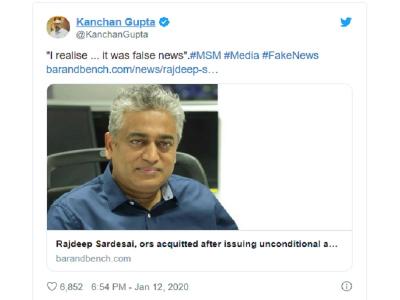 पत्रकार और टीवी एंकर राजदीप सरदेसाई ट्विटर पर ट्रोल हो रहे हैं। बीजेपी आईटी सेल हेड अमित मालवीय से लेकर देश के कुछ पत्रकार भी उनकी आलोचना कर रहे हैं। राजदीप सरदेसाई ने 2007 में आईपीएस अधिकारी राजीव त्रिवेदी के खिलाफ गलत न्यूज चलाने को लेकर माफी मांगी है, जिसके बाद से ट्विटर पर हैशटैग #FakeNews के साथ राजदीप की आलोचना हो रही है। बीजेपी आईटी सेल हेड अमित मालवीय ने लिखा है, "मुझे एहसास है ... यह झूठी खबर थी"। राजदीप सरदेसाई को यह अहसास कानूनी मामले में थप्पड़ खाने के बाद हुआ है और उनके पास माफी मांगने के अलावा कोई विकल्प भी नहीं था... लेकिन आपको बता दें कि ये एक बहुत बड़े प्रोपगेंडा का हिस्सा था।''