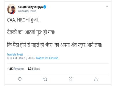 भारतीय जनता पार्टी (बीजेपी) के पश्चिम बंगाल के अध्यक्ष कैलाश विजयवर्गीय ने नागरिकता संशोधन कानून (CAA) और एनआरसी को लेकर एक तंजभरा ट्वीट किया है। जिसपर ट्विटर यूजर ने काफी मजेदार प्रतिक्रियाएं दी है। कैलाश विजयवर्गीय ने आज (23 जनवरी) की सुबह ट्वीट करते हुए लिखा, ''सीएए, एनआरसी ना हुआ, देवकी का 'आठवां पुत्र' हो गया, कि पैदा होने से पहले ही 'कंस' को अपना अंत नजर आने लगा!''