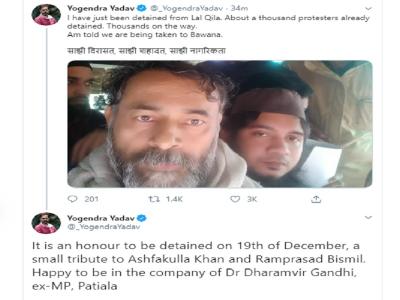 इसके अलावा एक और ट्वीट करते हुए योगेंद्र यादव ने लिखा, 19 दिसंबर को गिरफ्तार होना मेरे लिए गर्व की बात है। ये मेरी ओर से अशफाकउल्ला खाँ और रामप्रसाद बिस्मिल को एक छोटी सी श्रद्धांजलि है।