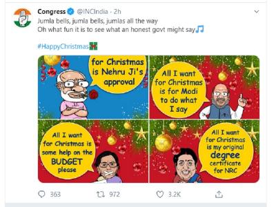 कांग्रेस ने अनोखे अंदाज में बीजेपी को दी क्रिसमस की बधाई, लिखा- 'जुमला बेल्स, जुमला बेल्स, जुमला...'
