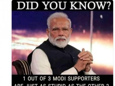 कांग्रेस की सोशल मीडिया प्रमुख दिव्या स्पंदना उर्फ रम्या ने ट्विटर पर एक मीम शेयर किया है जिसमें मोदी समर्थकों को 'स्टुपिड' कहा गया।