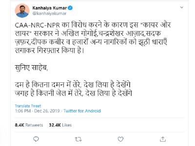 जवाहर लाल नेहरू विश्वविद्यालय के पूर्व छात्रसंघ अध्यक्ष और सीपीआई नेता कन्हैया कुमार नागरिकता संशोधन कानून (CAA) के खिलाफ लगातार विरोध कर रहे हैं। इसी क्रम में उनका एक ताजा ट्वीट चर्चा में आया है। कन्हैया कुमार ने केंद्र की नरेंद्र मोदी सरकार को 'कायर और लायर' सरकार कहा है। कन्हैया कुमार ने ट्वीट किया, ''CAA-NRC-NPR का विरोध करने के कारण इस "कायर और लायर" सरकार ने अखिल गोगोई, चन्द्रशेखर आजाद, सदफ जफर, दीपक कबीर व हजारों अन्य नागरिकों को झूठी धाराएं लगाकर गिरफ्तार किया है। सुनिए साहेब, दम है कितना दमन में तेरे, देख लिया है देखेंगे। जगह है कितनी जेल में तेरे, देख लिया है देखेंगे।''