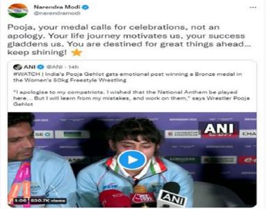 दरअसल स्वर्ण पदक नहीं हासिल कर सकते से निराश पूजा की सरहाना करते हुए पीएम मोदी ने लिखा, था, 'पूजा आपका पदक लाना माफी का नहीं बल्कि जश्न का हकदार है। आपके जीवन की यात्रा हमें प्रेरित करती हैं। आपकी सफलता हमें खुशी देती है। आपको भविष्य में और बड़ी सफलताएं मिलेंगी....ऐसे ही चमकते रहिए।' पीएम मोदी का ट्वीट कुछ ही देर में वायरल हो गया।