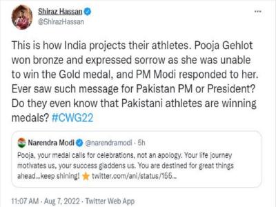 पीएम मोदी के पूजा की सराहना करने और ढाढ़स बंधाने के ट्वीट पर पाकिस्तान के पत्रकार शिराज हसन की भी प्रतिक्रिया आई है। उन्होंने ट्वीट कर लिखा, 'इस तरह भारत अपने एथलीटों को प्रोजेक्ट करता है। पूजा गहलोत ने कांस्य जीता और दुख व्यक्त किया क्योंकि वह स्वर्ण पदक जीतने में असमर्थ थीं, और पीएम मोदी ने उन्हें जवाब दिया। कभी पाकिस्तान के पीएम या राष्ट्रपति के लिए ऐसा संदेश देखा है? क्या उन्हें यह भी पता है कि पाकिस्तानी एथलीट पदक जीत रहे हैं?