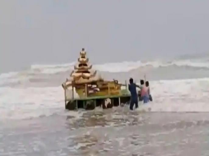 Gold Chariot Viral Video: आंध्रप्रदेश के श्रीकाकुलम जिले के सुन्नापल्ली तट पर एक सोनो का रथ (Gold Coloured Chariot) मिला है। बताया जा रहा है कि यह रथ चक्रवात असानी (Cyclone Asani) के कारण यहां बह कर आया है। इस रथ के बह के आने का वीडियो सोशल मीडिया पर खूब वायरल हो रहा है। यह रथ कहां से बह कर आया है, इसकी अभी पुष्टी नहीं हुई है, लेकिन लोगों का कहना है कि ये रथ पास के देश या एशिया के किसी देश का हो सकता हैं। हालांकि इसके बारे में इंटेलिजेंस और उच्च अधिकारियों को सूचना दे दी गई है।