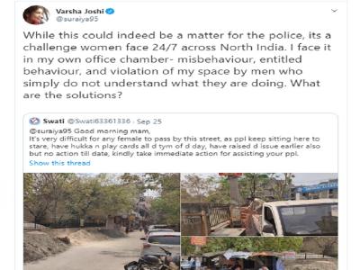 आईएएस अफसर वर्षा जोशी को एक महिला ने टैग करते हुए ट्वीट किया। ट्वीट यूजर स्वाती नाम की महिला ने लिखा- ''गुड मॉर्निंग मैम, यहां ये आना-जाना काफी मुश्किल हो रहा है। यहां चौराहे पर कुछ स्थानीय लोग हुक्का और कार्ड खलते हुए कमेंट पास करते हैं। मैंने इसके बारे में पहले भी शिकायत की थी लेकिन कोई एक्शन नहीं लिया गया। आपसे निवेदन है कि प्लीज इसकी ओर ध्यान दें।''