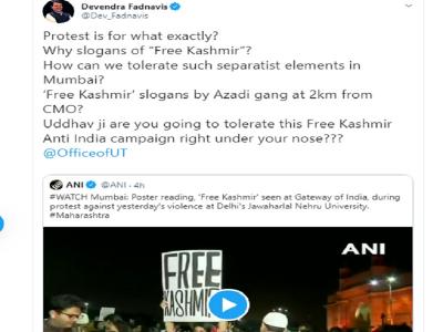 महाराष्ट्र के पूर्व मुख्यमंत्री देवेंद्र फड़नवीस ने जवाहर लाल यूनिवर्सिटी (जेएनयू) मामले को लेकर मुंबई में हुए विरोध प्रदर्शन पर सवाल उठाए हैं। मुंबई के गेटवे ऑफ इंडिया पर विरोध प्रदर्शन के दौरान एक प्रदर्शनकारी एक तख्ती थामे नजर आईं, जिस पर लिखा था "फ्री कश्मीर"। जिसके बाद ट्विटर पर "फ्री कश्मीर" का हैशटैग ट्रेंड में भी आया। फड़नवीस ने इसको लेकर ट्वीट किया और महाराष्ट्र की उद्धव ठाकरे की सरकार पर भी तंज कसा है। फड़नवीस का ये ट्वीट वायरल हो गया है। जवाहर लाल यूनिवर्सिटी (जेएनयू) में रविवार शाम हुई हिंसा, तोड़फोड़ बाद कई जगह विरोध प्रदर्शन हो रहे हैं।