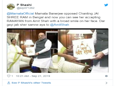 ट्विटर यूजर पी शाहसी ने वायरल तस्वीर को शेयर कर लिखा है, जय श्री राम के नारों का विरोध करने वाली ममता बनर्जी ने अमित शाह से रामायण ली है क्योंकि वह शेर अमित शाह से डर गई हैं। इस ट्ववीट में यूजर ने अमित शाह और ममता बनर्जी दोनों को टैग किया है।