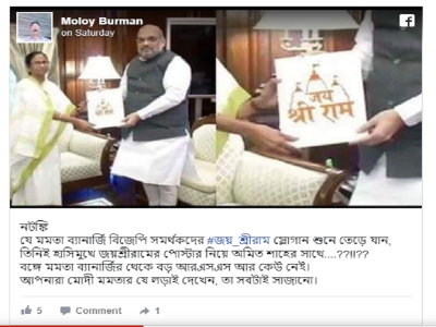 वहीं एक फेसबुक यूजर ने बांग्ला भाषा में लिखा है, ''जो ममता बनर्जी बीजेपी समर्थक के जय श्री राम के नारों को सुनकर भड़क जाती हैं, वही ममता बनर्जी हंसते हुये चेहरे के साथ जय श्री राम का पोस्टर ले रही हैं। बंगाल में ममता बनर्जी से बड़ा कोई संघ को मानने वाला नहीं है। आप जो भी ममता बनर्जी और पीएम मोदी व बीजेपी के बीच का विवाद देखते हैं वह सिर्फ एक दिखावा है।''