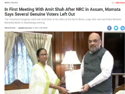 पश्चिम बंगाल की मुख्यमंत्री ममता ने केंद्रीय गृह मंत्री अमित शाह से मुलाकात कर एनआरसी से प्रभावित इन लोगों की दशा सुधारने के लिए हस्तक्षेप की भी मांग की थी। ममता की गृह मंत्री शाह के साथ यह पहली बैठक थी, जिन्होंने (शाह ने) प्रधानमंत्री नरेंद्र मोदी के दूसरे कार्यकाल के शुरू होने के साथ करीब तीन महीने पहले गृह मंत्रालय का प्रभार संभाला था।
