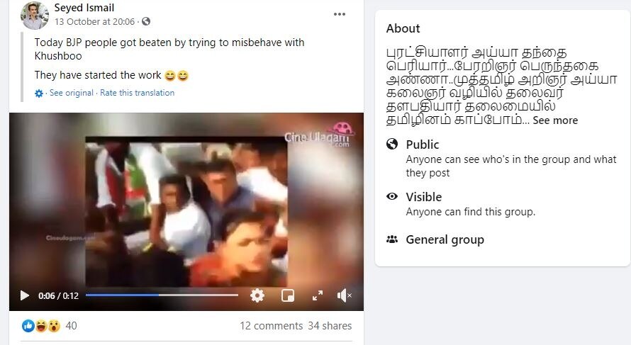 अब खुशबू के भाजपा में शामिल होते ही सोशल मीडिया पर एक वीडियो इस दावे के साथ साझा किया जा रहा है कि भाजपा में शामिल होने के बाद एक बीजेपी कार्यकर्ता ने रैली के दौरान खुशबू सुंदर को छेड़ने की कोशिश की। इसके बाद खुशबू ने शख्स को थप्पड़ मारा।