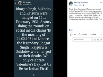 14 फरवरी को 'वैलेंटाइन डे' के रूप में मनाया जाता है, लेकिन इसे 'काला दिवस' के रूप में चलाने की जबरदस्त कोशिश की जा रही है। इसके लिए कुछ पोस्ट सोशल मीडिया पर शेयर की जा रही है, जिसमें दावा किया जा रहा है कि महान क्रांतिकारी भगत सिंह, सुखदेव और राजगुरु को 14 फरवरी 1931 के दिन ही फांसी दी गई थी। वहीं कुछ लोगों का दावा है कि भगत सिंह को इसी दिन फांसी की सजा सुनाई गई थी।