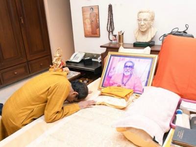 तस्वीर में दिख रहा है कि सोनिया गांधी की तस्वीर एक सादे चादर की बिस्तर पर रखी है और उसके सामने हाथ जोड़ माथे टेके उद्धव ठाकरे दिखाई दे रहे हैं।