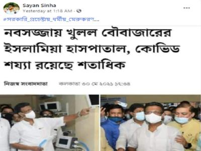 दरअसल कई फेसबुक यूजर्स ने तृणमूल कांग्रेस के नेता और कोलकाता के मेयर फिरहाद हकीम की दो तस्वीरें पोस्ट की हैं। इसमें फिरहाद पुनर्निर्मित 'इस्लामिया अस्पताल' का उद्घाटन कर रहे हैं।