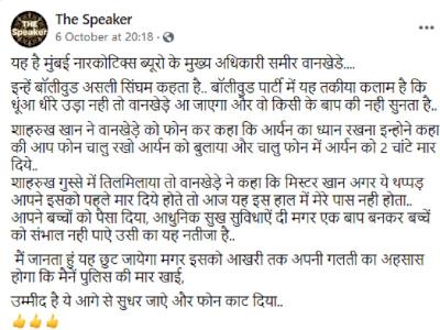 सोशल मीडिया पर दावा किया जा रहा है कि आर्यन की गिरफ्तारी के बाद शाहरुख ने समीर वानखेड़े को फोन किया और बेटे का ध्यान रखने की गुजारिश की। इस पर समीर वानखेड़े ने शाहरुख को होल्ड पर रहने को कहा और आर्यन को बुलाया और दो थप्पड़ मारे।
