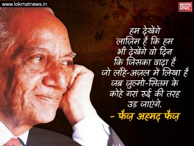 एशिया के सबसे महानत कवियों में से एक फ़ैज अहमद फ़ैज की 20 नवबंर पुण्यतिथि है। साम्यवादी विचारधारा के कवि रहे फैज अहमद फैज का जन्म 13 फरवरी 1911 सियालकोट, पंजाब (अब पाकिस्तान में) हुआ था। उर्दु साहित्य के पुरोधाओं में से एक फैज अहमद फैज सूफी परंपरा से प्रभावित थे। फ़ैज अहमद फ़ैज की शायरी का अनुवाद हिंदी, रूसी, अंग्रेजी आदि कई भाषाओं में हो चुका है। नक्श-ए-फरियादी, दस्त-ए-सबा, जिंदांनामा, दस्त-ए-तहे-संग, मेरे दिल मेरे मुसाफिर, सर-ए-वादी-ए-सिना इनकी प्रमुख रचनाओं में से एक हैं। फैज अहमद फैज की पुण्यतिथि पर पेश है उनकी कुछ नज्में-