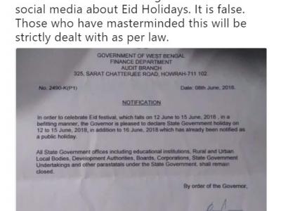 पश्चिम बंगाल में ईद की छुट्टी से जुड़ा एक जाली खबर सोशल मीडिया पर वायरल हो गयी है। कोलकाता पुलिस ने इस जाली पत्र की प्रति शेयर करते हुए कहा है कि इसे जारी करने वालों को खिलाफ कड़ी कार्रवाई की जाएगी। इस जाली पत्र में दावा किया गया है कि पश्चिम बंगाल सरकार ने ईद के उपलक्ष्य में 12 जून से 15 जून तक छुट्टी की घोषणा की है। जाली पत्र को पश्चिम बंगाल सरकार के एडिशनल सेक्रेटरी राजशेखर बंदोपाध्याय की तरफ से जारी किया गया बताया गया है।