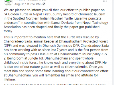 कहा जा रहा है नेपाल में इसे पहली बार देखा गया है, ट्रस्ट के अनुसार, धनुशधाम संरक्षित वन में पशु रक्षक चंद्रदीप सदा द्वारा कछुए को बचाया गया था। सोशल मीडिया पर ये कछुआ खूब चर्चे में है।