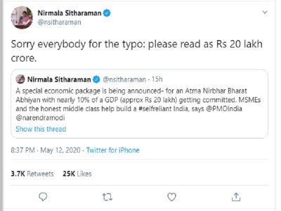 इस ट्वीट के बाद वित्त मंत्री सीतारमण को जैसे ही अपनी गलती समझ में आई उन्होंने माफी मांगते हुए लिखा, ''टाइपिंग में हुई गलती के लिए आप सभी से माफी मांगती हूं। इसे 20 लाख करोड़ रुपये ही पढ़िए।''
