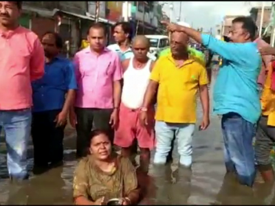 कांग्रेस विधायक दीपिका पांडेय सिंह बीच सड़क पर धरने पर बैठ कीचड़ में नहाने लगीं।