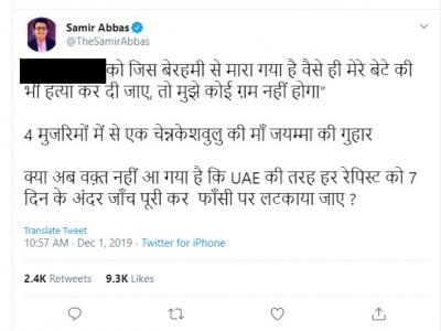 टीवी न्यूज के परिचित चेहरे समीर अब्बास ने ट्वीट कर लिखा, ''पीड़िता को जिस बेरहमी से मारा गया है वैसे ही मेरे बेटे की भी हत्या कर दी जाए, तो मुझे कोई गम नहीं होगा'' 4 मुजरिमों में से एक चेन्नकेशवुलु की मां जयम्मा की गुहार। क्या अब वक्त नहीं आ गया है कि UAE की तरह हर रेपिस्ट को 7 दिन के अंदर जांच पूरी कर फांसी पर लटकाया जाए?''