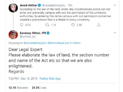 आईपीएस (IPS) संदीप मित्तल ने अपने अधिकारिक ट्विटर हैंडल से जावेद अख्तर के भी एक ट्वीट का जवाब दिया, जो काफी वायरल हुआ। लेखक और गीतकार जावेद अख्तर ने ट्वीट कर लिखा था, 'लॉ ऑफ लैंड के मुताबिक, किसी भी परिस्थिति में पुलिस किसी भी यूनिवर्सिटी के कैंपस में यूनिवर्सिटी के अधिकारियों की इजाजत के बिना नहीं घुस सकती है। जामिया कैंपस में बिना इजाजत घुसकर पुलिस ने एक ऐसी मिसाल कायम की है जो हर यूनिवर्सिटी के लिए एक खतरा है।'