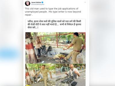 हिंदी फिल्मों के जाने माने गीतकार और पटकथा लेखक जावेद अख्तर अपने एक ट्वीट को लेकर सोशल मीडिया पर ट्रोल हो रहे हैं। जावेद अख्तर ने अपने ट्वीट में कुछ तस्वीरें शेयर की है, जिसमें दिख रहा है कि एक पुलिस वाला बुजुर्ग शख्स के साथ बदसूलकी कर रहा है। तस्वीरों में बुजुर्ग एक टाइपराइटर के साथ दिख रहा है। इस तस्वीर को शेयर कर जावेद ने लिखा, ये बुजुर्ग अपने टाइपराइटर से बेरोजगार लोगों के लिए नौकरी के आवेदन टाइप करता था। पुलिसकर्मी ने बुजुर्ग का टाइपराइटर तोड़कर उसकी रोजी-रोटी छीन ली। जावेद अख्तर ने इस ट्वीट को 20 अक्टूबर 2019 को किया है। इस ट्वीट पर चार हजार से ज्यादा रिट्वीट्स हैं और दस हजार से ज्यादा लाइक्स हैं। (खबर लिखे जाने तक)