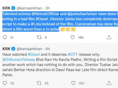 केआरके ने ट्वीट में लिखा- दसवीं फिल्म देख ली। यह ओटीटी के ही लायक है। कुमार विश्वास भाई कवि हो कविता पढ़ो। फिल्म का स्क्रिप्ट लिखना एक अलग काम है जिसका आपसे कोई लेना-देना नहीं है।