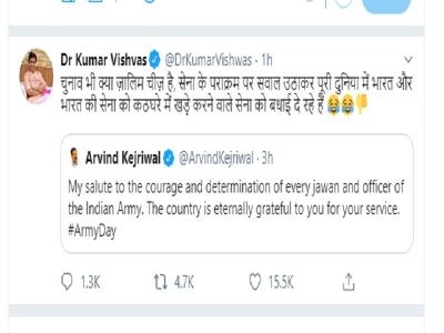 आर्मी डे के मौके पर आम आदमी पार्टी(आप) के पूर्व नेता और कवि कुमार विश्वास ने दिल्ली सीएम औप आप के मुखिया अरविंद केजरीवाल पर निशाना साधा है। अरविंद केजरीवाल के एक ट्वीट को रिट्वीट करते हुए कुमार विश्वास ने लिखा, ''चुनाव भी क्या जालिम चीज है, सेना के पराक्रम पर सवाल उठाकर पूरी दुनिया में भारत और भारत की सेना को कठघरे में खड़े करने वाले सेना को बधाई दे रहे हैं।'' कुमार विश्वास का यह ट्वीट वायरल हो गया है। कुमार विश्वास के ट्वीट करने के महज एक घंटे के अंदर इसपर 17 हजार लाइक्स और पांच हजार रिट्वीट है। (खबर लिखे जाने तक)