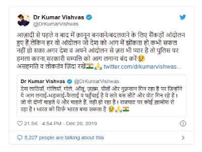एक अन्य ट्वीट में कुमार विश्वास ने कहा, आजादी से पहले व बाद में कानून बनवाने/बदलवाने के लिए सैंकड़ों आंदोलन हुए हैं,लेकिन हर वो आंदोलन जो देश को आग में झोंकता हो, कभी सफल नहीं हो सका। अगर देश व अपने आंदोलन से जरा भी प्यार है तो पुलिस पर हमला करना, सरकारी सम्पत्ति को आग लगाना बंद करें। असहमति व लोकतंत्र जिंदा रखें।