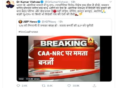 पश्चिम बंगाल की मुख्यमंत्री ममता बनर्जी ने भारतीय जनता पार्टी (बीजेपी) को चेतावनी देते हुए कहा कि वह संशोधित नागरिकता कानून (सीएए) और प्रस्तावित राष्ट्रीय नागरिक पंजी (एनआरसी) पर संयुक्त राष्ट्र की निगरानी में जनमत संग्रह कराए और यदि वह ‘‘व्यापक मत’’ हासिल करने में विफल रहती है तो उसे सत्ता छोड़नी होगी। ममता बनर्जी के इस बयान पर आम आदमी पार्टी के पूर्व नेता और कवि कुमार विश्वास ने निशाना साधा है। कुमार विश्वास ने ट्वीट कर लिखा है, ''भारत के आंतरिक मामले में यूएन?राजनैतिक विरोध-विद्वेष सब ठीक है दीदी, जमकर करिए, जोरदार करिए, सब साथ आएंगे,पर देश के आंतरिक मतभेद में विदेशी पंच बुलाने की बात बेहद घटिया और खेदजनक है। यहीं लड़िए...जीतिए...कानून बनाइए...बदलिए। बाकी यूएन या किसी भी विदेशी पंच की ऐसी की तैसी।''