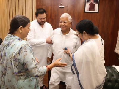 ममता बनर्जी के आने से पहले से लालू प्रसाद यादव, राबड़ी देवी और तेजस्वी प्रसाद यादव इंतजार कर रहे थे। कमरे में घुसते ही ममता बनर्जी ने लालू प्रसाद यादव के पैर छूकर आशीर्वाद लिया।