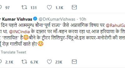 दिल्ली के मुख्यमंत्री अरविंद केजरीवाल ने एक बार फिर कांग्रेस राहुल गांधी से गठबंधन पर विचार करने का निवेदन किया है। इसी बात पर चुटकी ली.कुमार विश्वाश ने ट्वीट किया किया है। उन्होंने लिखा 'दो दिन पहले आत्ममुग्ध बौना 'पूर्ण राज्य' जैसे अप्रासंगिक विषय पर राहुल गांधी को कोस रहा था। कांग्रेस के दफ़्तर पर मां-बहन करवा रहा था. आज हरियाणा के लिए फिर उसी द्वार पर 'ललायित' है. बौने के ट्विटर लिलिपुट-चिंटूओ, इस कायर-मनोरोगी की सत्तालिप्सा के लिए क्यूं रोज़ गालियां खाते हो?'