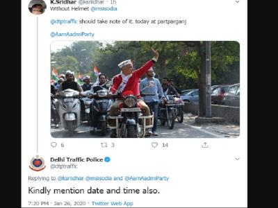 इस रैली की बिना हेलमेट वाली मनीष सिसोदिया की एक तस्वीर को ट्विटर यूजर के श्रीधर ने दिल्ली के ट्रैफिक पुलिस को टैग कर दिया। तस्वीर टैग करते हुए के श्रीधर ने लिखा, यह पटपड़गंज का दृश्य है।