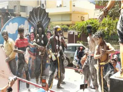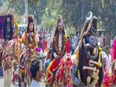 शोभायात्रा में सबसे आगे रथ पर बाबा मशान नाथ के विशाल चित्र के साथ भक्त शिव तांडव स्त्रोतम "जटाटवीगलज्जलप्रवाहपावितस्थले गलेऽवलम्ब्य लम्बितां भुजङ्गतुङ्गमालिकाम्। मड्डमड्डमन्निनादवड्डमर्वयं चकार चण्डताण्डवं तनोतु नः शिवः शिवम्।" का पाठ करते हुए चल रहे थे।