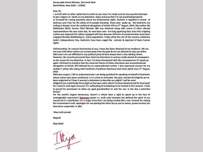 मेरे पास आपको लिखने के अलावा और कोई विकल्प नहीं बचा है। आशा और प्रार्थना करती हूं कि मुझे मेरे मौलिक अधिकारों के बारे में सवाल उठाने के लिए दंडित / या गिरफ्तार नहीं किया जाऐगा। कश्मीर अंधेरे के बादलों में घिरा हुआ है और मैं अपने लोगों की सुरक्षा के लिए डरती हूं, जिसमें वे भी शामिल हैं। हम कश्मीरी 5 अगस्त, 2019 को आर्टिकल 370 के एकतरफा निरस्त होने के बाद से निराशा में घिर रहे हैं। मेरी मां महबूबा मुफ्ती को उसी दिन से हिरासत में लिया गया था।आज जब बाकी देश भारत का स्वतंत्रता दिवस मना रहा है, कश्मीरियों को जानवरों की तरह कैद कर दिया गया और उन्हें बुनियादी मानवाधिकारों से वंचित किया गया है। आपको अच्छी तरह से पता है कि मुझे अपने घर पर नजरबंद कर के रखा गया है। मुझे इतना भी नहीं बताया जाता है कि कब मेरे से मिलने वालों को घर से भगा दिया जाता है और मुझे बाहर निकलने की अनुमति नहीं है। अजीब है, क्योंकि मैं किसी भी राजनीतिक दल से जुड़ा नहीं हूं और हमेशा से एक कानून का पालन करने वाली नागरिक रही हूं।''