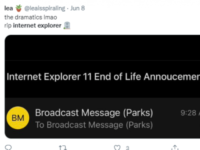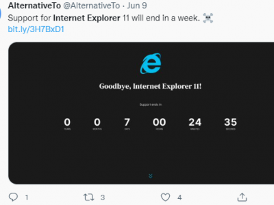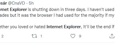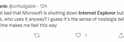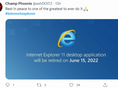 Microsoft 365 ने 17 अगस्त 2021 को इंटरनेट एक्स्प्लोरर के लिए समर्थन समाप्त कर दिया और माइक्रोसॉफ्ट टीम्स ने IE के लिए 30 नवंबर 2020 को समर्थन समाप्त कर दिया। रिपोर्टों के अनुसार, इंटरनेट एक्स्प्लोरर 15 जून 2022 को बंद करने के लिए तैयार है। वहीं, इंटरनेट एक्स्प्लोरर के बंद होने के बारे में जानकर सोशल मीडिया पर यूजर्स अपनी प्रतिक्रियाएं व्यक्त कर रहे हैं। यूजर्स इंटरनेट एक्स्प्लोरर को मिस करने की बातें कर रहे हैं।