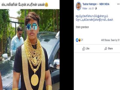 सोशल मीडिया पर एक लड़के की तस्वीर वायरल हो रही है। जिसने तस्वीर में काले रंग के कपड़े पहने हैं और सोने के गहनों से लदा हुआ है। सोशल मीडिया पर इस तस्वीर को दिखाकर लोग ये दावा कर रहे हैं कि ये दक्षिण भारत के दिग्गज नेता और डीएमके के प्रमुख एमके स्टालिन का पोता है। इस तस्वीर को फेसबुक यूजर तुषार नटराजन ने फेसबुक पेज न्यू इंडिया पर शेयर किया है।