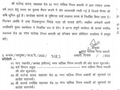 नगर निगम प्रशासन की ओर से जारी आदेश में कहा गया है कि राजेंद्र यादव, सहायक ग्रेड-3 नगर पालिक निगम धमतरी के द्वारा दशहरा उत्सव वर्ष 2022 हेतु रावण का पुतला तैयार कराने में घोर लापरवाही बरती गई है जिससे निगम की छवि धूमिल हुई है। उपरोक्त कारणों को दृष्टिगत उन्हें तत्काल प्रभाव से निलंबित किया जाता है। वहीं 4 अन्य कर्मचारियों को कारण बताओ नोटिस जारी किया गया है।