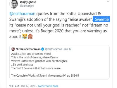 वित्त मंत्री निर्मला सीतारमण को ट्विटर पर एक शख्स ने 'स्वीटी' बोलकर संबोधित किया है, जिसके बाद ट्विटर यूजर्स ने जमकर उस शख्स की क्लास लगाई है। वित्त मंत्री निर्मला सीतारमण ने 12 जनवरी 2020 को स्वामी विवेकानंद की कुछ पंक्तियां शेयर की। जिसको रिट्वीट करके संजोय घोष नामक एक ट्विटर यूजर ने लिखा, 'स्वीटी अपने गलत लिखा है, तब तक मत रुको जब तक लक्ष्य को न प्राप्त कर लो लेकिन आपने लिखा अब सपने मत देखो। कहीं ये 2020 के बजट के बारे में तो चेतावनी नही दे रहीं हैं आप।'