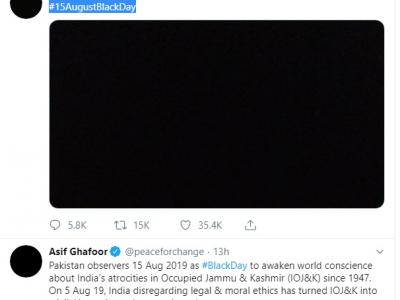 पाक सेना के प्रवक्ता ने अपने अधिकारिक वेबसाइट पर #15AugustBlackDay ट्वीट किया है।