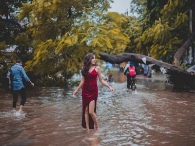 अदिति सिंह ने बिहार के बाढ़ में लाल रंग के फ्रंट कट वाली लॉन्ग ड्रेस पहनी है। इस फोटोशूट में आप देख सकते हैं सड़कों पर पानी ही पानी है और आदिति आराम से बाढ़ के पानी के बीच में पोज दे रही हैं।