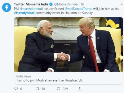 प्रधानमंत्री मोदी ने ह्यूस्टन समारोह में शामिल होने के अमेरिकी राष्ट्रपति डोनाल्ड ट्रंप के फैसले की प्रशंसा की है। प्रधानमंत्री ने कई ट्वीट किए और कहा कि भारतीय मूल के समुदाय के साथ मिलकर कार्यक्रम में ट्रंप का स्वागत करने का वह इंतजार कर रहे हैं।