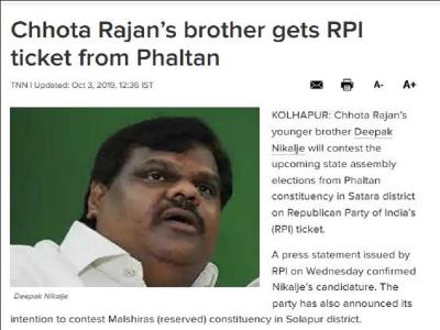छोटा राजन का भाई दीपक निकलजे को आरपीआई ने पश्चिमी महाराष्ट्र के सतारा जिले जिले की फलटण सीट से टिकट दिया है।