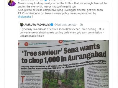 महाराष्ट्र में 'महा विकास अघाड़ी' की सरकार बनने के बाद भी बीजेपी-शिवसेना के बीच सियासी बयानबाजी खत्म होने का नाम नहीं ले रही है। इसी क्रम में महाराष्ट्र के पूर्व सीएम देवेंद्र फड़नवीस की पत्नी अमृता फड़नवीस ने शिवसेना को तंज करते हुए एक ट्वीट किया। इस ट्वीट में अमृता फड़नवीस ने लिखा, ''पाखंड एक बीमारी है, गेट वेल सून शिवसेना। शिवसेना तभी पेड़ कटवाती है जब उसे कमीशन मिलता है। ये क्षमा करने योग्य पाप नहीं है।'' इस ट्वीट के साथ अमृता ने एक अंग्रेजी अखबार का स्क्रीनशॉट भी साझा किया है। जिसमें लिखा है- औरंगाबाद में बाला साहेब ठाकरे का स्मारक बनाने के लिए शिवसेना यहां पर 1000 पेड़ कटवाने वाली है।