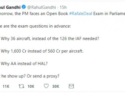 कांग्रेस अध्यक्ष राहुल गांधी ने बुधवार को कहा था कि प्रधानमंत्री नरेन्द्र मोदी को गुरुवार को संसद में राफेल सौदे पर ‘ओपन बुक’ परीक्षा का सामना करना है। राहुल ने गांधी ने कहा कि वो पीएम मोदी ने तीन महत्वपुर्ण सवाल पूछेंगे।
