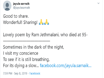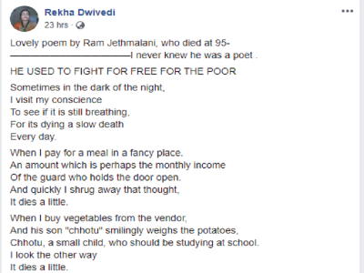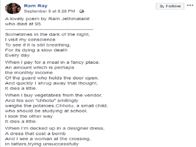 फेसबुक पर कई यूजर ने इस कविता को शेयर कर लिखा है कि इस प्यारी कविता को लिखने वाले राम जेठमलानी का 95 वर्ष की उम्र में निधन हो गया।