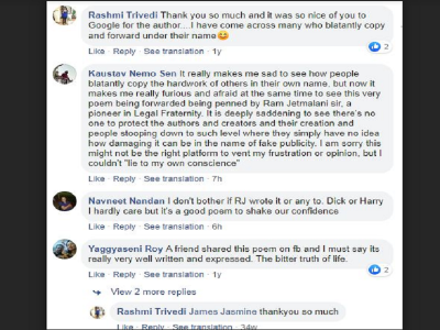 पोस्ट पर लोगों ने कमेंट कर के भी रश्मी त्रिवेदी को इस कविता के लिये बधाई दी है। जिसका रश्मी त्रिवेदी ने रिप्लाई भी किया है।