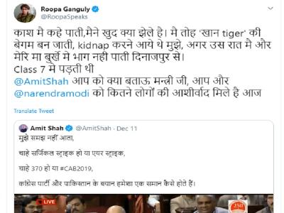 राष्ट्रपति रामनाथ कोविंद ने गुरुवार को नागरिकता (संशोधन) विधेयक 2019 को अपनी मंजूरी दे दी, जिसके बाद यह एक कानून बन गया है। नागिरकता संशोधन बिल पर हर कोई अपने पक्ष और विपक्ष में विचार रख रहा है। इसी बीच बीजेपी नेता और राज्यसभा सांसद रूपा गांगुली ने ट्वीट कर अपनी आपबीती बताई है। रूपा गांगुली ने ट्वीट कर लिखा, ''काश मैं कह पाती, मैंने खुद क्या झेला है। मैं तो 'खान tiger' की बेगम बन जाती। किडनैप करने आये थे मुझे, अगर उस रात मैं और मेरी मां बुर्के में भाग नहीं पाती दिनाजपुर से। कक्षा सातंवीं में पढ़ती थी। अमित शाह जी आपको क्या बताऊं मंत्री जी आपको और पीएम नरेंद्र मोदी को आज कितने लोग आशीर्वाद दे रहे हैं।'' रूपा गांगुली राजनीति में आने से पहले अभिनेत्री और गायिका थीं।